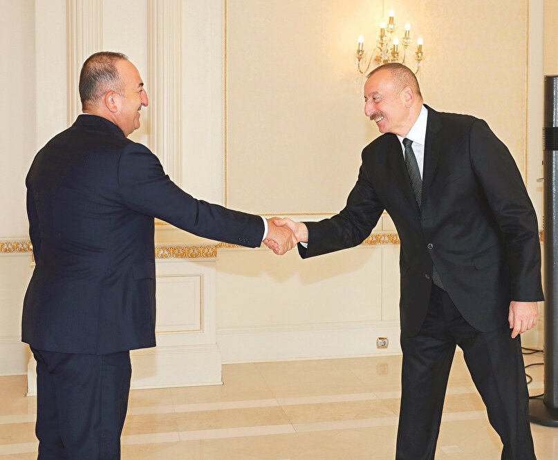 Çavuşoğlu burada Azerbaycan Cumhurbaşkanı İlham Aliyev ile görüştü. Kabulde yaptığı konuşmada Aliyev, Azerbaycan ordusunun topraklarını kurtarmak için başlattığı operasyondan bahsederek, Ermenistan Başbakanı Nikol Paşinyan'ın Rusya Devlet Başkanı Vladimir Putin'e mektup yazarak yardım istediğini hatırlattı.
