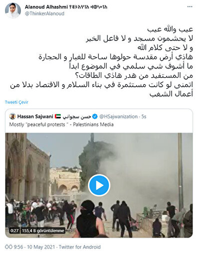 Bir başka paylaşımda ise "Burası toprak ve taş avluya dönüştürdükleri kutsal topraklar. Bu konuda asla barışçıl bir şey görmüyorum. Ayaklanmalar yerine barış inşasına ve ekonomiye yatırım yapılmasını dilerdim" denilerek Filistinlilerin direnişi, "ayaklanma" ifadesiyle eleştirildi.