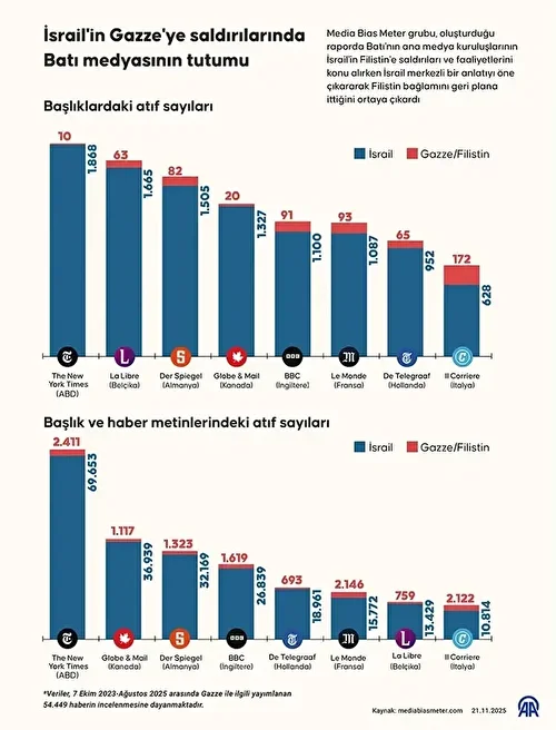 Batı medyasının, İsrail'in Gazze'ye saldırıları hakkında ürettiği içeriklerin çalışıldığı raporda, Kuzey Amerika ve Avrupa'dan 8 büyük haber kuruluşunun 7 Ekim 2023-Ağustos 2025 arasında yayımladığı 54 bin 449 makale incelendi.