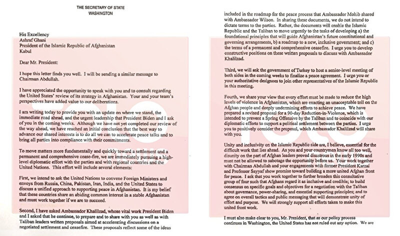 ABD Dışişleri Bakanı Antony Blinken, Afganistan Cumhurbaşkanı Eşref Gani’ye yazdığı mektupta, ülkedeki barış sürecine ilişkin dört öneri sıraladı. Öneriler arasında Biden yönetiminin barış anlaşmasının sonuçlandırılması için Türkiye’den yardım isteyeceğine dair bir madde de yer aldı.