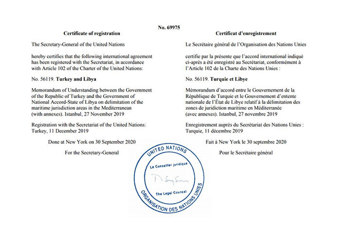 Birleşmiş Milletler, Türkiye ve Libya arasında 27 Kasım 2019'da imzalanan "Deniz Yetki Alanlarının Sınırlandırılmasına İlişkin Mutabakat Muhtırası" anlaşmasını BM'nin 102. maddesi gereği onaylayarak tescil etti.