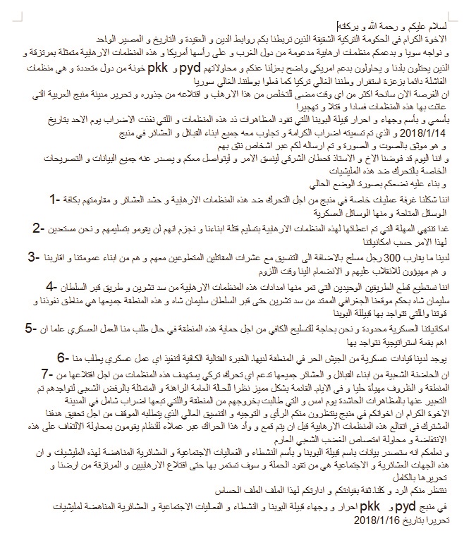 “Türk askeri bize sadece 20 kilometre uzaklıkta. Türk askeri ve ÖSO birlikleri için Münbiç’in sanılandan çok daha kolay bir bölge olduğunun bilinmesini istiyoruz. PKK birkaç saat içerisinde sadece Münbiç’i değil Fırat’ın batısını tamamen terk edecektir. Münbiç’i Fırat Kalkanı bölgesine dahil etme kararlığından vazgeçmeyeceğiz,. Lütfen Türk kardeşlerimiz sesimizi duysun ve bizi bu zulümden kurtarsın. Türk askeri ile savaştırmak için gençlerimizin beynini yıkamaya çalışıyorlar. Gençlerimizi Afrin’e ölüme gönderiyorlar. Münbiç’te yaşayan Kürt, Arap ve Türkmenlerin, din ve insanlık düşmanı PKK’dan kurtarılması için yardımınıza ihtiyacımız var.”