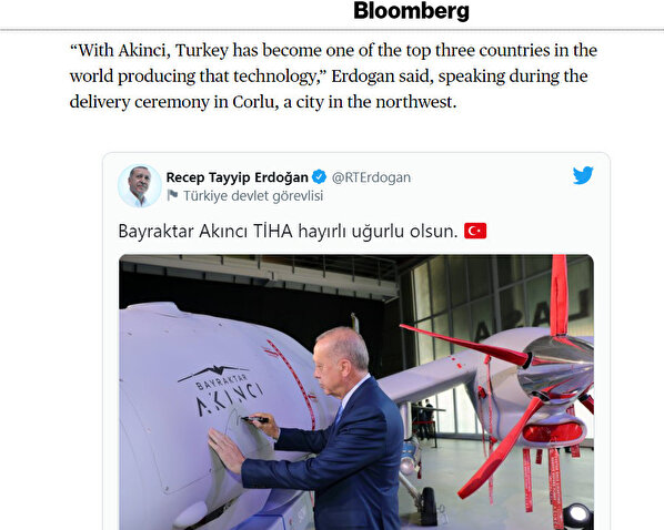 Türkiye, insansız hava araçlarında gücüne güç katmaya devam ediyor. Cumhurbaşkanı Recep Tayyip Erdoğan, dün Çorlu'da Baykar Akıncı Taarruzi İnsansız Hava Aracı'nın (TİHA) Türk Silahlı Kuvvetleri'ne (TSK) teslimat törenine katıldı. ABD basınından Bloomberg, törenin ardından havalanan Akıncı TİHA'yla ilgili gelişmeyi okurlarına aktardı.