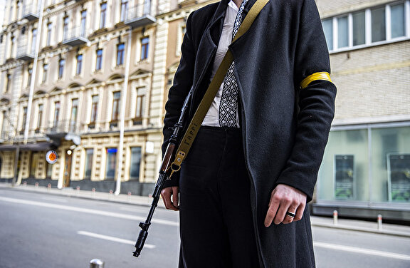 Ukrayna'nın en genç milletvekili Sviatoslav Yuraş da eline aldığı silahla Kiev'in meydanlarında onlarca poz verdi. Özgürlük Meydanı yakınlarında konuşan Sviatoslav Yuraş, Kiev'in abluka altında olduğunu söyledi.