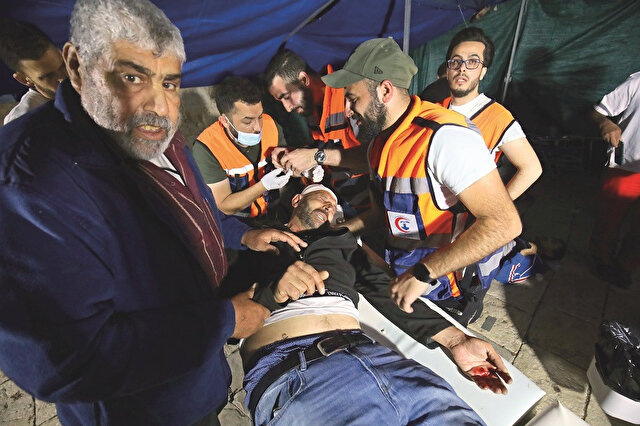 Aksa’nın avlusunda da tam bir devlet terörü yaşandı. Yerleşkedeki kubbelere çıkan keskin nişancılar Filistinlilere plastik mermi yağdırdı.