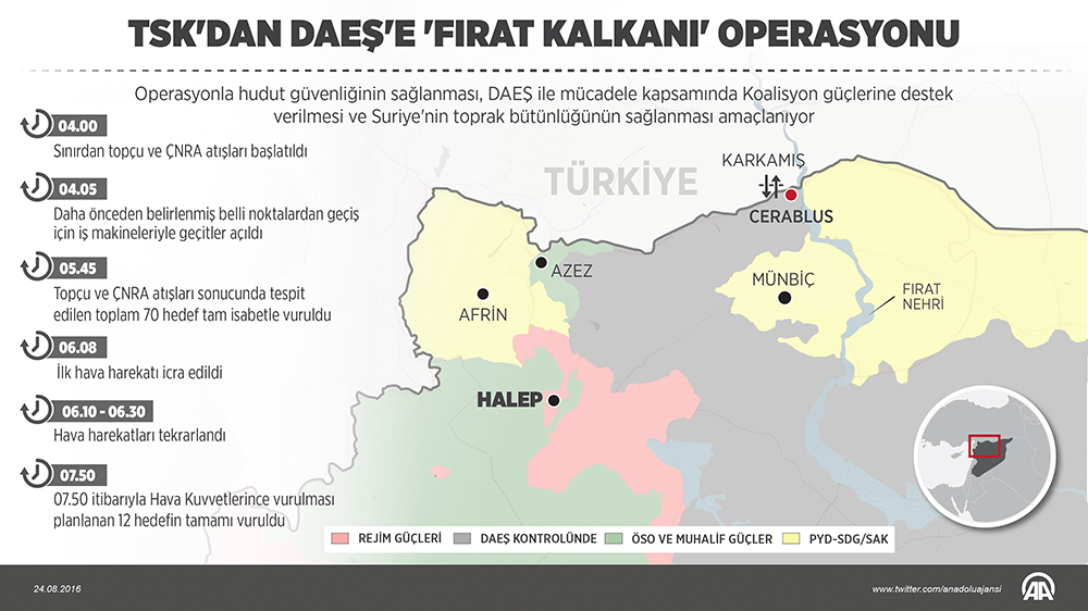 Kuzey Suriye'de bir Kürt kantonu oluşturulması için Cerablus'u ele geçirmeye çalışan PYD, eğer bölgeyi alırsa, sınırımızda kontrol tamamen PYD'nin eline geçmiş olacak. Geçtiğimiz günlerde Cumhurbaşkanı Recep Tayyip Erdoğan'ın, "Suriye'nin kuzeyinde bir devlet kurulmasına asla izin vermeyeceğiz" ifadeleriyle keskin bir şekilde tavrını ortaya koymuştu. Bu açıklamalardan sadece birkaç gün sonra, Türkiye Cerablus'a askeri operasyon için harekete geçti.