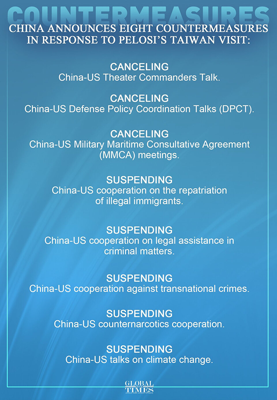 Alınan önlemlerin duyurusu, Pekin'in Tayvan adasını çevreleyen askeri tatbikatları ile geldi. Daha önce Çin, Pelosi'ye ve doğrudan aile üyelerine yönelik yaptırımları açıklamıştı. sonrasında ise yapılan açıklamada Pekin, Pelosi'nin ziyaretini “hırçın ve kışkırtıcı” olarak nitelendirdi.