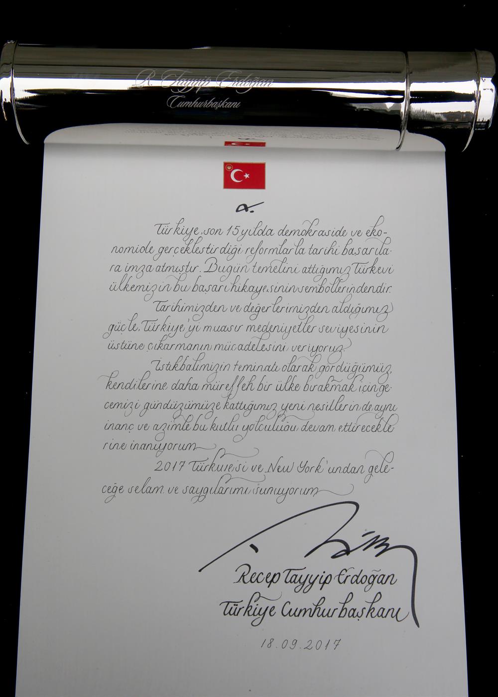 Erdoğan, BM binasının karşısında bulunan yeni Türkevi'nin temel atma töreninde, kendisinin kaleme aldığı mektubu özel bir kapsülün içinde temele yerleştirdi.
