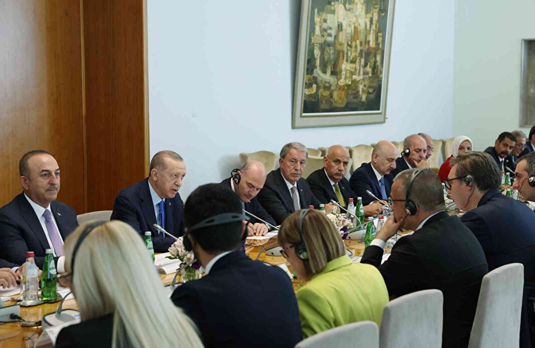 Cumhurbaşkanı Recep Tayyip Erdoğan Balkan turunun ikinci durağı olan Sırbistan'a gitti. Sırbistan Cumhurbaşkanı Aleksandar Vucic tarafından resmi törenle karşılandı. Sırbistan bu ziyarete büyük önem verirken Erdoğan'ın barışı tesis eden bir etken olduğu rolüne dikkat çekiliyor. Cumhurbaşkanı Erdoğan, Sırp mevkidaşı Aleksandar Vuçiç ile ikili görüşme gerçekleştirdi. İki liderin baş başa ve heyetler arası görüşmenin ardından kameraların karşısına geçerek ortak basın toplantısı düzenlemesi bekleniyor.