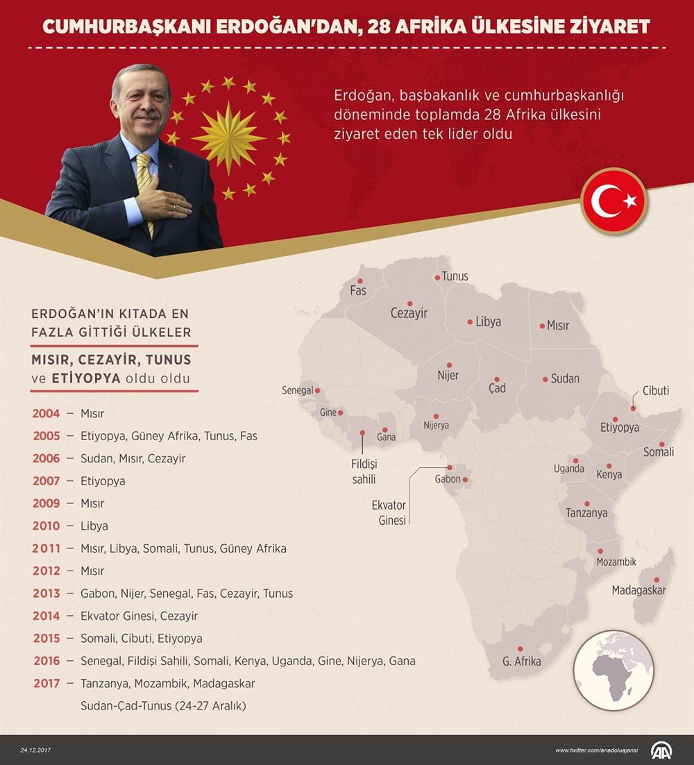 Cumhurbaşkanı Erdoğan, 24-25 Aralık'ta Sudan'a yaptığı ziyaretin ardından 26 Aralık'ta Çad'a ve 27 Aralık'ta da Tunus'a ziyarette bulunacak.