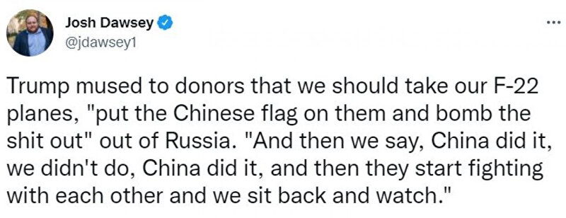 Rusya-Ukrayna savaşı devam ederken, ABD'nin eski Başkanı Donald Trump'tan ilginç bir öneri geldi. Trump, "F-22 uçaklarımızı alıp üzerlerine Çin bayrağı asmalı ve Rusya'yı bombalamalıyız." ifadelerini kullandı.