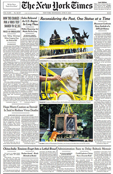 Dünya basınında bugünkü manşetlerde heykellerin yıkılmasıyla başlayan ırkçılık tartışmaları, koronavirüse karşı etkili olduğu tespit edilen Dexamethasone ilacı ve Çin ile Hindistan gerilimi yer aldı. New York Times gazetesi ırkçı ve sömürgecilik dönemlerini hatırlatan heykel ve sembollerin yıkılmasının dünyaya yayılan bir hareket olduğunu yazdı. ABD'nin farklı eyaletlerinde yıkılan heykellerin hem Avrupa hem de Kuzey Amerika'da yeni bir dönüşüme yol açtığı belirtildi. Başlangıçta sadece ABD'deki ırkçılık ekseninde giden tartışmaların daha sonra Avrupa sömürgeciliği ve Yerli Amerikalılara uygulanan ayrımcılığa doğru kaydığı belirtildi. Bazı İngiliz gazeteleri koronavirüs ölüm oranını düşürdüğü tespit edilen Dexamethasone ilacını mercek altına alırken, Al Jazeera haber sitesi ise Hindistan ve Çin arasındaki gerilimini manşete taşıdı.