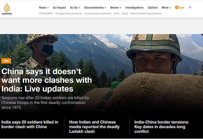 Çin ve Hindistan gerilimini manşete taşıyan Al Jazeera 1975'ten sonraki en ölümcül saldırı olarak değerlendirilen saldırıda 20 Hint askerinin öldürüldüğünü ve tansiyonun yeniden yükseldiğini belirtti.