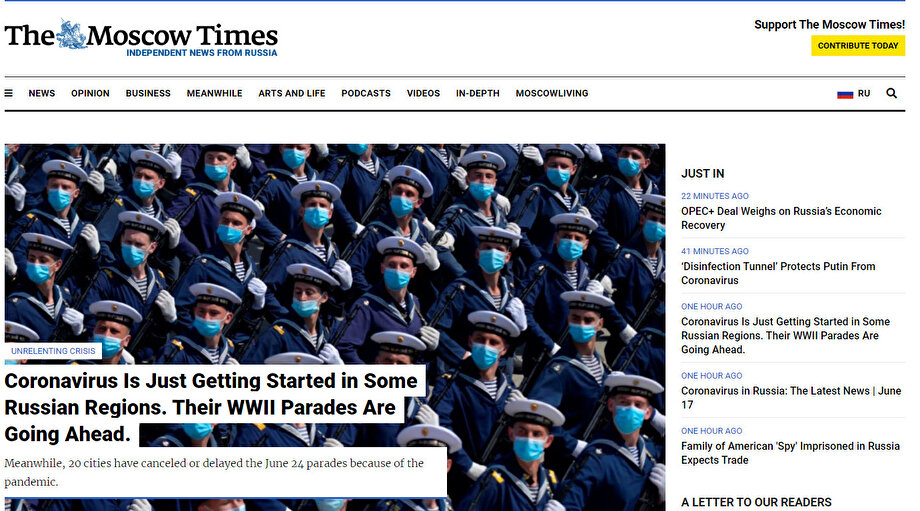 Moscow Times haber sitesi manşetine taşıdığı haberinde vakaların arttığı ülkede bazı bögelerde virüs krizinin daha yeni başladığına işaret etti Rusya'nın Zabaykalsky Krai bölgesinin valisi Alexander Ostrov “Durum daha da kötüye gidiyor, enfekte kişilerin sayısı artıyor." açıklamasını yaptı. Rusya'da ayrıca 20 bölgede Sovyetler Birliği’nin Nazi Almanyası'nı mağlup etmesinin 75. yılı nedeniyle askeri geçit törenlerinin iptal edildiği duyuruldu. Rusya Devlet Başkanı Vladimir Putin bir süre önce yaptığı açıklamada geçit törenlerinin yapılacağını söylemişti.