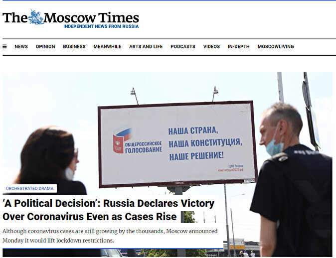 Rusya'da Pazartesi günü sadece Moskova'da 2 bin yeni vaka , ülke genelinde ise 9 bin yeni vaka görüldü. Buna rağmen Rusya diğer ülkelerde olduğu gibi kısıtlamasız hayata geçiyor. Rusya'nın normalleşme kararını erken aldığına dikkat çeken gazete bu kararın "politik" olduğunu vurguluyor. Gazeteye konuşan Vasily Vlassov'a göre bu " Her şey yolundaymış gibi göstermek için yapılan bir illüzyon"