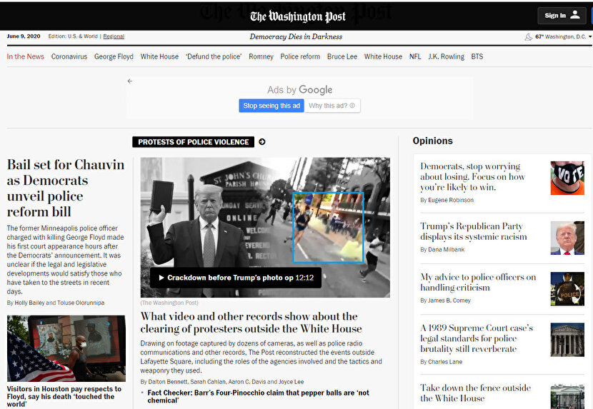 Washington Post gazetesinin manşetinde ise Amerikalı George Floyd'u gözaltına alırken boynuna dizini basarak ölümüne sebep olmakla suçlanan eski polis memuru Derek Chauvin (44), ilk kez hakim karşısına çıkması vardı. Hakim Jeannice M. Reding, ilk gözaltına alındığında 1 milyon dolar olarak belirlenen Chauvin’in kefalet bedelini 1 milyon 250 bin dolara çıkardı. Gazete ayrıca Demokrat Partililerin polis teşkilatlarının yeniden yapılandırılması tekliflerinin görüşüldüğü bilgisini verdi.