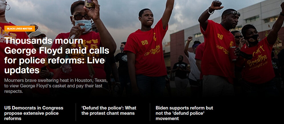 Manşetine George Floyd protestolarını taşıyan Al Jazeera ABD'de Demokratların, polis şiddeti ve ırksal adaletsizlikle mücadele etmek için kapsamlı bir mevzuat paketi açıkladığını aktardı. Öte yandan binlerce ABD'li Geroge Floyd için Houston'da düzenlenen cenazeye katıldı.
