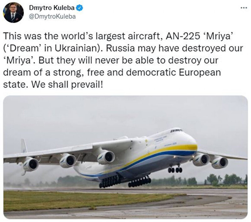 Ukrayna Dışişleri Bakanı Dmitro Kuleba, uçaktan bir kareye yer verdiği paylaşımında, "AN-225, dünyanın en büyük uçağıydı. Rusya 'hayalimizi' yok etmiş olabilir ama güçlü, özgür ve demokratik bir Avrupa devleti hayalimizi asla yıkamayacak. Biz kazanacağız"diye yazdı.