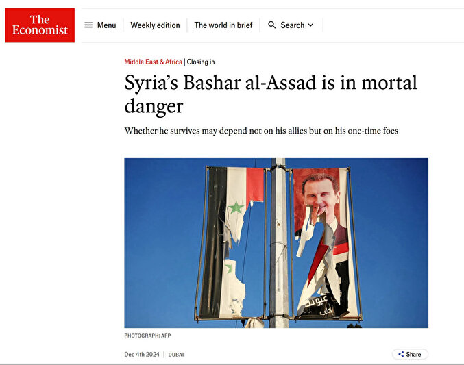 "Muhalifler 27 Kasım'da kuzey Suriye'de sürpriz bir saldırı başlattıklarında, Beşar Esad rejiminin dağınık olduğunu gördüler. Esad birlikleri kaçtı. İsyancılar birkaç gün içinde Suriye'nin ikinci büyük şehri Halep'i ele geçirdi. İlerleme o zamandan beri 120 km güneydeki Hama şehri civarında yavaşladı, ancak durmadı. Esad yönetimi on yıldır ilk kez savunmasız görünüyor"