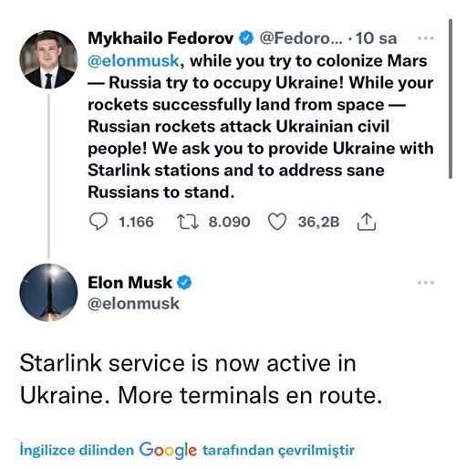 - "Sevgili Elon Musk! Siz Mars'ı kolonileştirmeye çalışırken, Rusya Ukrayna'yı kolonileştirmeye çalışıyor! Roketleriniz uzaydan başarıyla inerken, Rus roketleri Ukrayna'daki anaokullarına ve hastanelere saldırıyor! Desteğe ihtiyacımız var. Sizden Ukrayna'ya Starlink sağlamanızı istiyorum."
