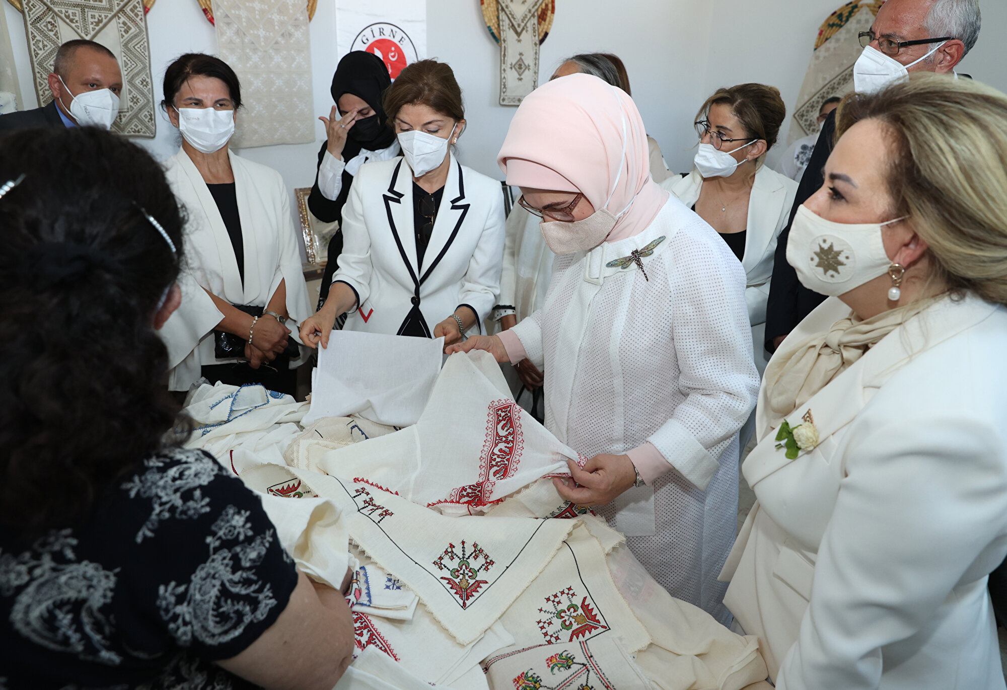 Cumhurbaşkanı Erdoğan'a eşlik etmek için Kuzey Kıbrıs Türk Cumhuriyeti'nde (KKTC) bulunan Emine Erdoğan'a Girne Belediyesi Sosyal Yaşam Merkezinde geleneksel Kıbrıs el sanatları ve motifleri ile Kıbrıs'a özgü bitkilerin sunumu yapıldı.