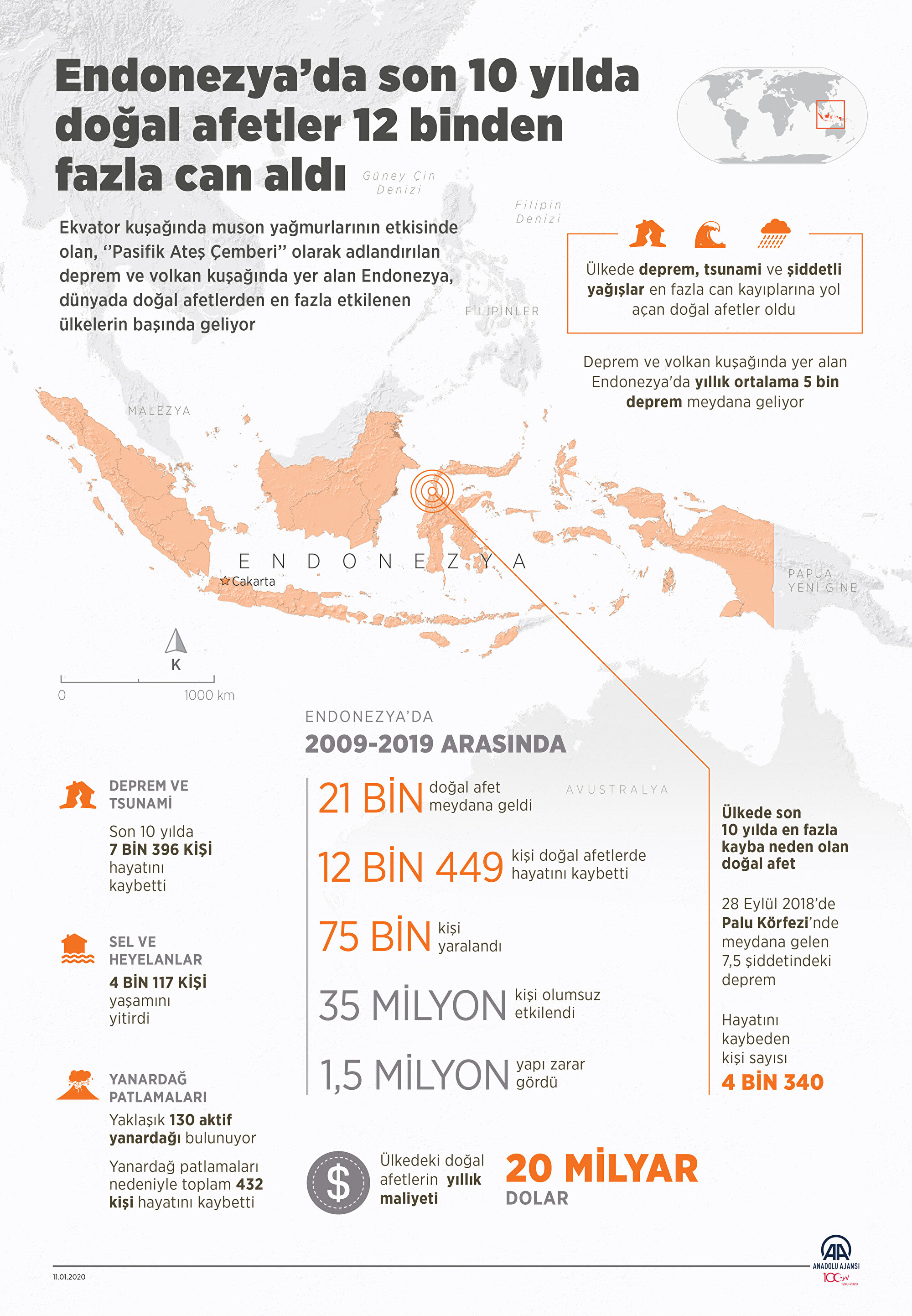 Ülkede son 10 yılda, deprem, tsunami ve şiddetli yağışlar en fazla can kayıplarına yol açan doğal afetler oldu- Deprem ve tsunamilerde 7 bin 396 kişinin can kaybı yaşadığı ülkede, sel ve heyelanlarda ise 4 bin 117 kişi öldü- 35 milyon kişinin etkilendiği ve 75 bin kişinin yaralandığı doğal afetlerde, 1,5 milyon yapı zarar gördü- Deprem ve volkan kuşağında yer alan Endonezya'da yıllık ortalama 5 bin deprem meydana geliyor