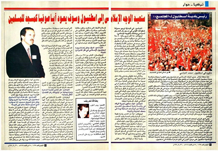 - Cumhurbaşkanı Erdoğan, 1994 yılında İstanbul Büyükşehir Belediye Başkanı olduğu sırada, İslam dünyasının en köklü ve uluslararası Arapça yayın yapan Al-Mujtama Dergisi'ne bir röportaj verdi. Erdoğan'ın Muhammed El Abbasi'ye verdiği mülakatı gazeteci Ahmed Yusuf'un ortaya çıkardı. Röportajda Erdoğan, Ayasofya'nın Müslümanlar için bir gün mutlaka yeniden cami olacağını ifade ediyor.
