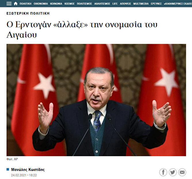 Selçuklu ve Osmanlı dönemlerinde Ege Denizi için kullanılan ‘Adalar Denizi’ söylemi, geçtiğimiz gün Cumhurbaşkanı Erdoğan tarafından da tercih edildi. Erdoğan, "Doğu Akdeniz'den Karadeniz'e ve eskilerin Adalar Denizi dediği Ege'ye kadar, çevremizdeki tüm sulardaki haklarımızı sağlama alacağız" dedi. Erdoğan’ın bu söylemi Yunanistan’da yankı buldu. Yunan medyası, "Erdoğan Ege’nin adını değiştirdi" başlığıyla bu sözleri okuyucularına aktardı.