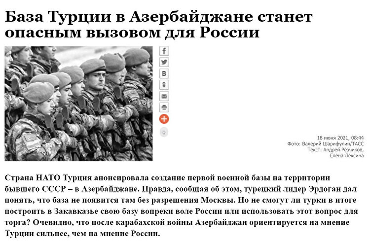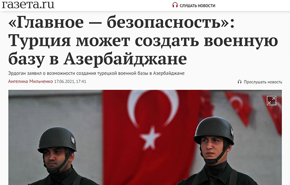 Cumhurbaşkanı Erdoğan'ın Karabağ'ı ziyareti sonrası Azerbaycan'a askeri üs kurulmasına ilişkin "Daha sonra gelişme olabilir" açıklamasında bulunması Rus medyasının gündeminde. Ülke basınında çıkan haberlerde, 'Türkiye'nin Azerbaycan'a askeri üs kurmasının Rusya için ciddi bir meydan okuma olacağı' belirtildi.