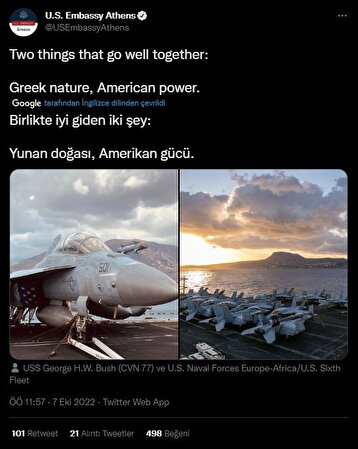 Yunanistan uluslararası hukuka aykırı olarak adaları silahlandırmaya devam ederken ABD tarafından adalara yerleştirilen askeri donanmalar gün geçtikçe artıyor. Cumhurbaşkanı Erdoğan'ın geçtiğimiz gün "Bir gece ansızın gelebiliriz" mesajını tekrarlamasının ardından ABD'nin Atina Büyükelçiliği'nden skandal bir paylaşım yapıldı. Söz konusu paylaşımda ABD'nin savaş uçaklarının yer aldığı fotoğraf kullanılarak "Yunan doğası, Amerikan gücü" notu düşüldü.