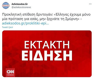 "Erdoğan'dan yeni bir meydan okuma: İzmir'i unutma!", "Erdoğan Yunanistan'a saldırdı", "Erdoğan'dan yeni provokasyon" başlıklarıyla Cumhurbaşkanı Erdoğan'ın açıklamalarını paylaşan Yunan medyasında adeta panik havası esti.
