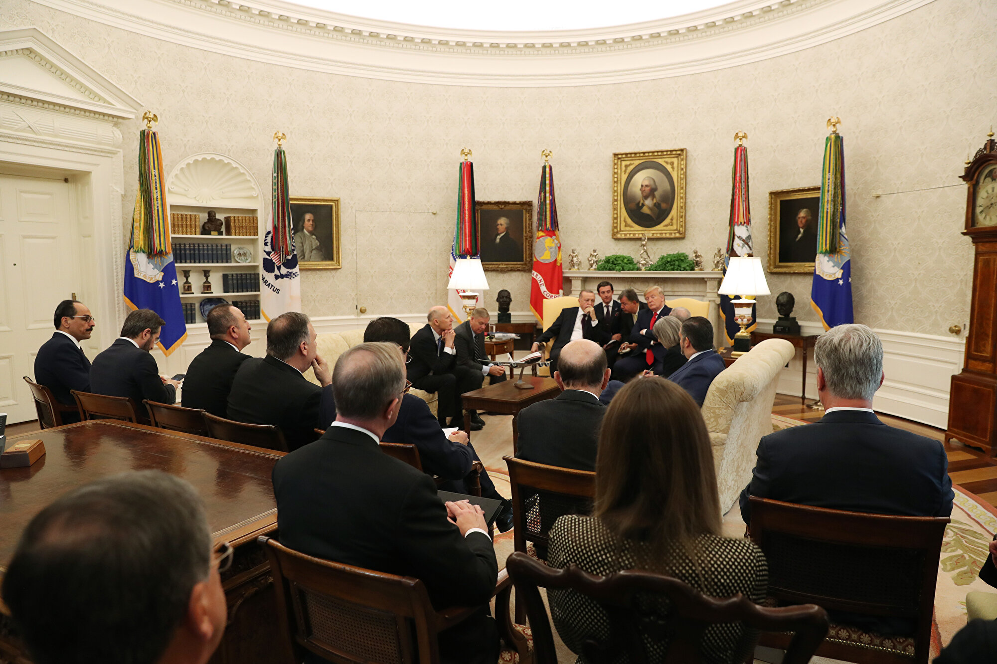 Cumhurbaşkanı Erdoğan, ABD’li senatörler ile Oval Ofis’te bir araya geldi. Erdoğan burada yaptığı konuşmada, "Sizin Kürt dediğiniz, PYD ve YPG’dir. Bu örgütler, terör örgütü PKK’nın yan kuruluşlarıdır" dedi. Cumhurbaşkanı Erdoğan, güvenli bölgenin tesis edilmesinin zorunlu olduğunu bir kez daha ifade ederek, "Güvenli bölgeye 6 ay ile 2 yıl arasında 1 milyon Suriyeli mülteciyi yerleştirebiliriz. Biz mültecilere 40 milyar dolar yatırım yaptık. Avrupa’dan şu ana kadar bize gelen miktar yalnızca 3 milyar Euro’dur" ifadelerini kullandı.