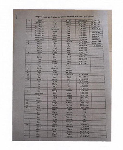 Araştırmalar sonucu, listede adı geçen 60 Suriyeli Ermeni'nin (toplam 19 aile), işgal altındaki topraklarda Ermenistan'ın yürüttüğü yasa dışı yerleşim sürecinde Zengilan bölgesine yerleştirildiği belirlendi.