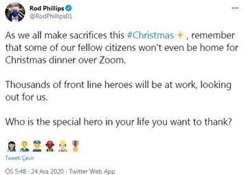 - "Hepimiz bu Noel'de fedakarlık yaparken, bazı vatandaşlarımızın Zoom üzerinden Noel yemeği için evde bile olmayacaklarını unutmayın. Binlerce ön cephe kahramanı iş başında olacak"
