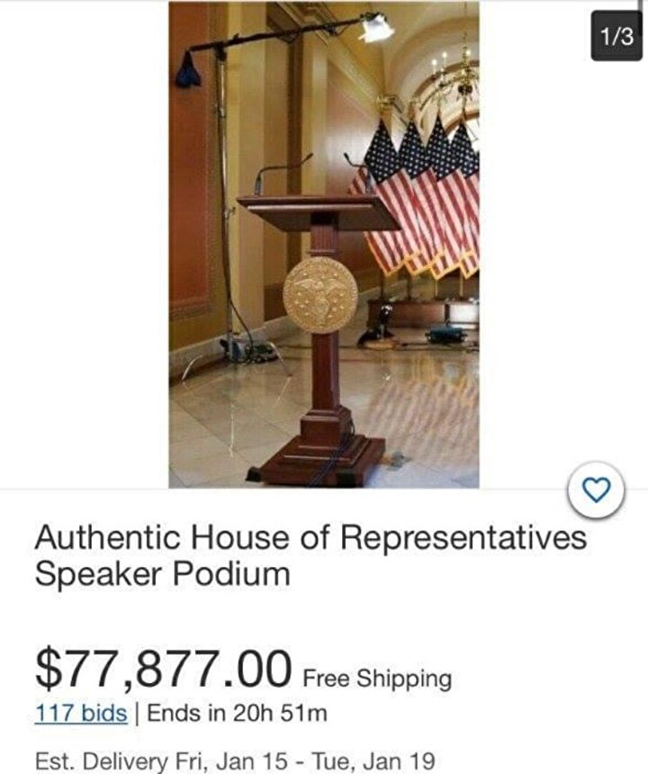 ABD'de yaşanan Konge baskınından tarihi fotoğraflar kameralara yansımıştı. O fotoğraflardan biri de kürsünün bir eylemci tarafından çalındığı fotoğraftı. Kongre binasından kürsüyü çalan ve kameralara gülümeyerek poz veren Adam Johson isimli eylemci kürsüyü satılığa çıkardı.