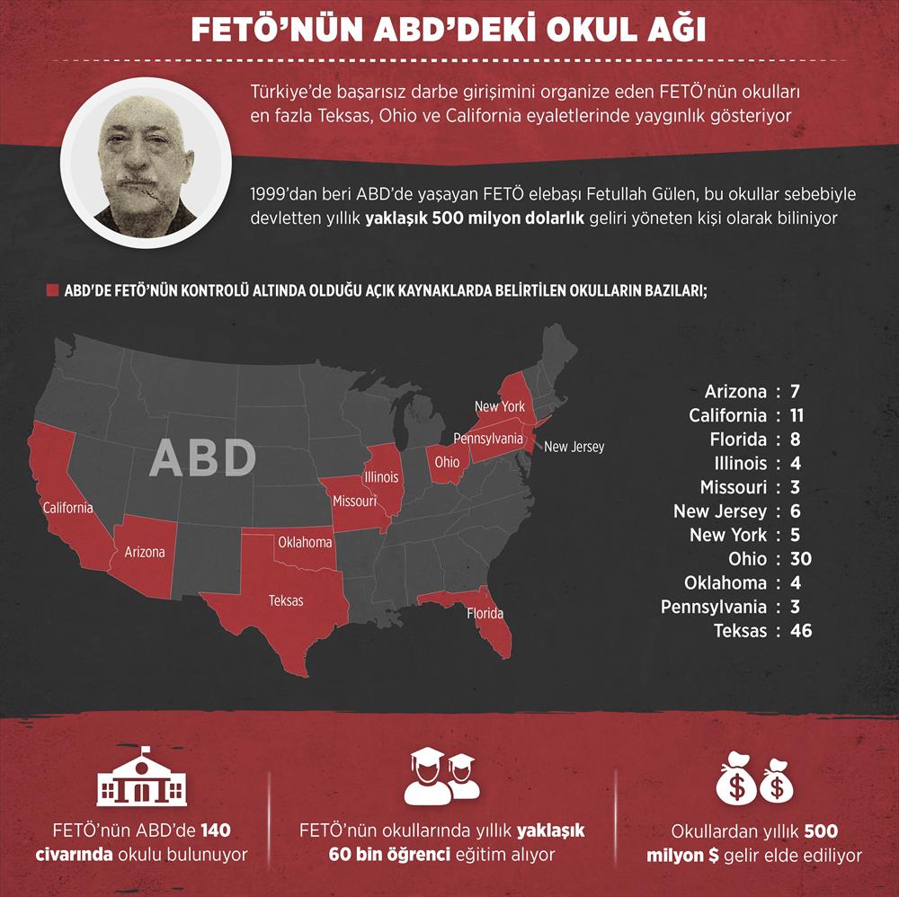 ABD'nin Pennsylvania eyaletinde 1999 yılından bu yana ikamet eden FETÖ elebaşı Fetullah Gülen, ülke genelinde 140 civarında sözleşmeli okulu ve bu okullar vasıtasıyla devletten yılda yaklaşık 500 milyon dolarlık geliri yöneten kişi olarak biliniyor.