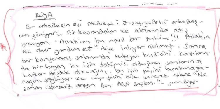 Söz konusu not kağıdında şu ifadeler yer almıştı: "Bir arkadaşın eşi rüyasında Medrese-i Yusufiye'den arkadaşları görüyor. Bir kazandalar ve altlarında ateş yanıyor. Sonra bir konferans salonunda buluyor kendisini, karşısında bir bayan bu işin takipçisi olduğunu sonlarına kadar destek olacağını, bu işin peşini bırakmayacağını söylüyor ve cep telefonunu bile vererek eşlere 'ne zaman isterseniz arayın ben ABD Başkanıyım' diyor."