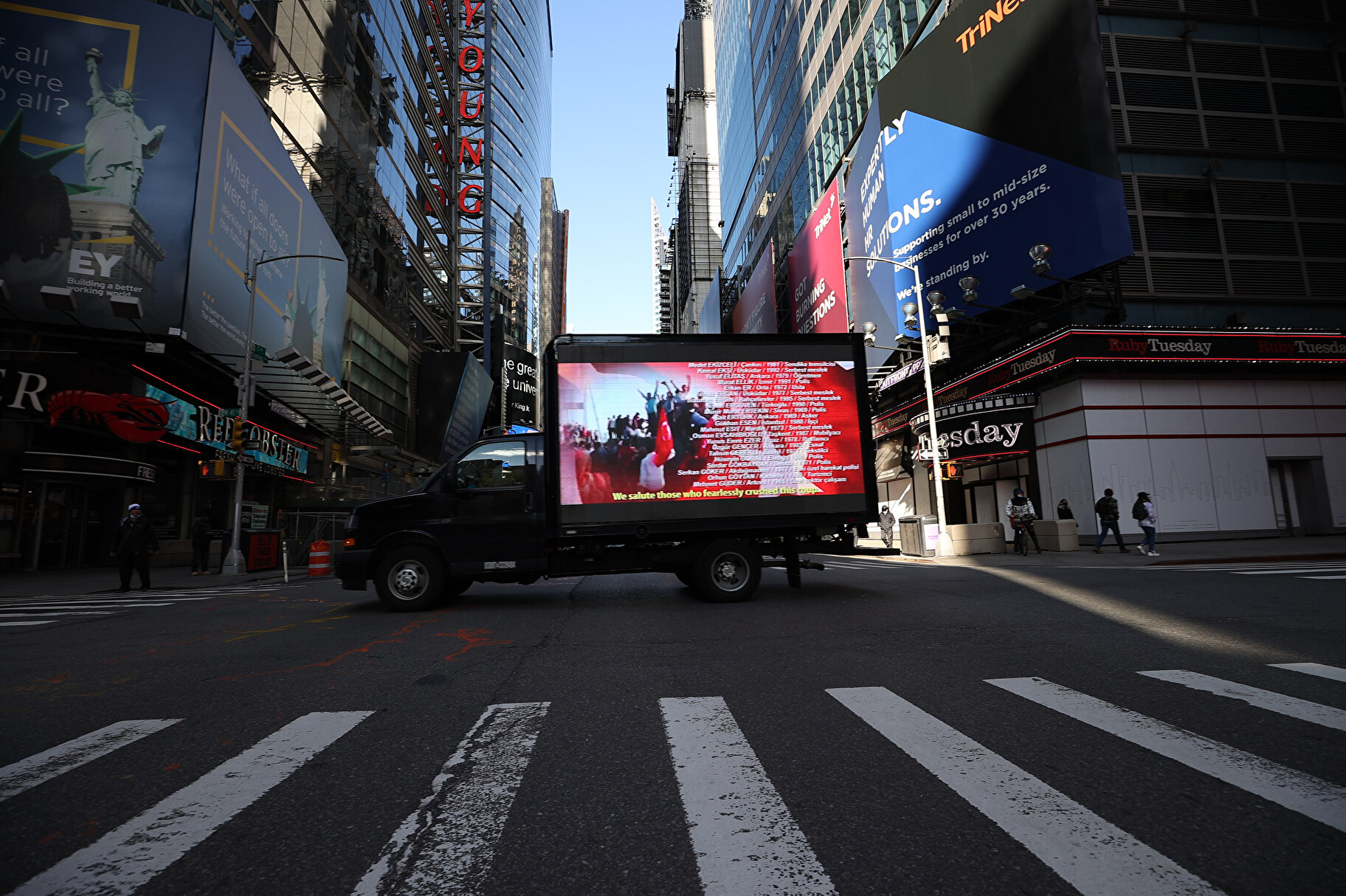 Türk-Amerikan Ulusal Yönlendirme Komitesi (TASC) organizasyonuyla Times Meydanı'nı dolaşan kamyonetteki dijital ekranda FETÖ örgütünün iç yüzünü ve 15 Temmuz darbe girişimini anlatan görseller yayımlandı.