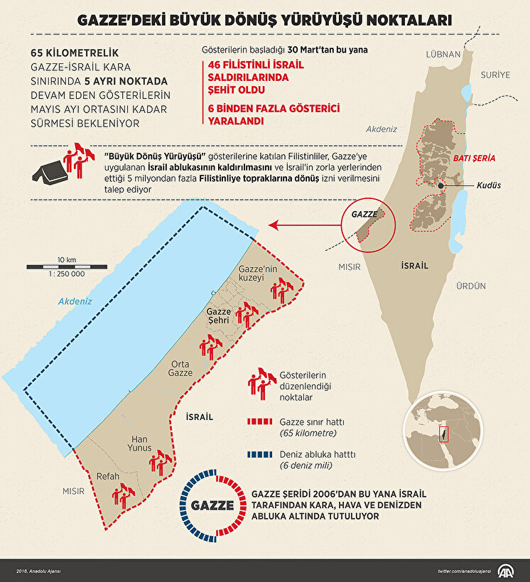 İsrail askerleri ise "sürgün edildikleri topraklarına dönmeyi ve 2006'dan beri Gazze'ye uygulanan hukuksuz ablukanın kaldırılmasını" talep eden sivil halkın üzerine gerçek mermilerle ateş açıyor.