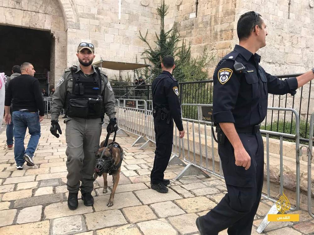 İsrail askerleri, ellerinde köpeklerle Mescid-i Aksa'da arama yapıyor.