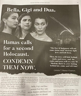 İşgalci İsrail'in katliamlarına açıkça tepki gösteren Filistin asıllı Amerikalı model kardeşler Gigi ve Bella Hadid ile İngiliz şarkıcı Dua Lipa, hedef gösterildi. Amerikalı haham Shmuley Boteach'in başında olduğu "Dünya Değerler Ağı" isimli örgüt, New York Times'a üç ismin resimlerini kullanarak tam sayfa ilan verdi. İlanda, "Bella, Gigi, Dua; ikinci Holokost çağrısı yapıyor. Onları derhal kınayın" denildi.