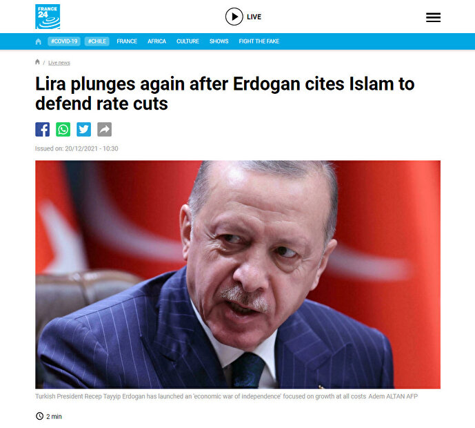 Fransız medya kuruluşu France 24, Cumhurbaşkanı Erdoğan'ın "ekonomik bağımsızlık savaşı" başlattığını yazdı. France 24 şu ifadeleri kullandı: