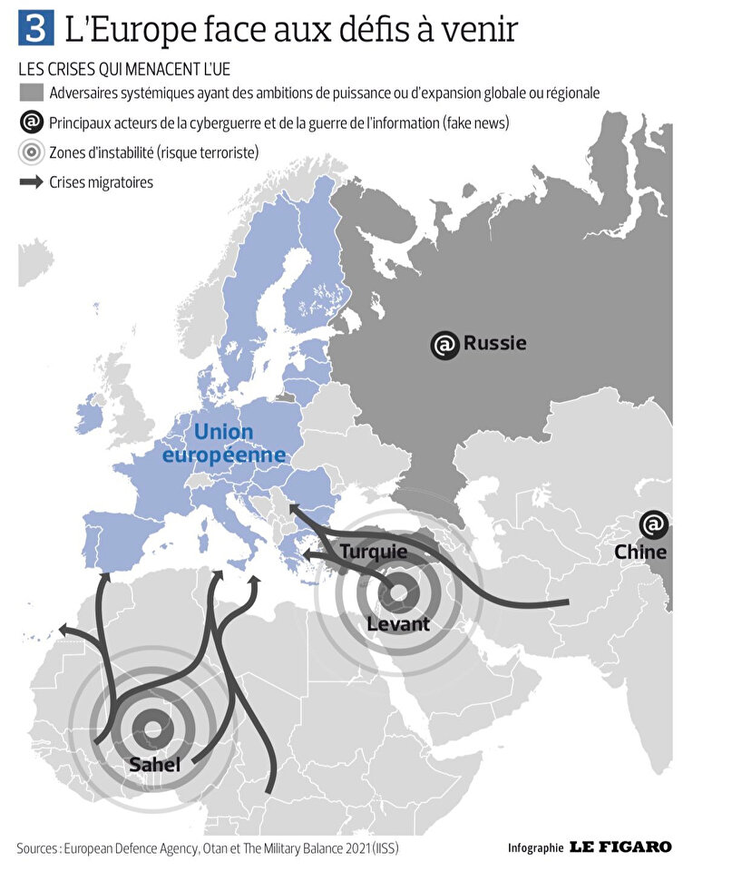 Fransa'da günlük yayımlanan uluslararası etkinliğe sahip Le Figaro gazetesi, “Avrupa önündeki zorluklarla karşı karşıya” başlığı adı altında Avrupa Birliği’ni (AB) tehdit eden güçler ve krizlere ilişkin bir grafik paylaştı.