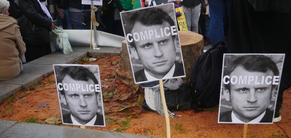 Göstericiler Kudüs’ün İsrail’in başkenti yapılmasını uygun bulmadığı açıklamasını yapan Fransa Cumhurbaşkanı Emmanuel Macron’un fotoğraflarını asıp Macron’u iş birlikçi olmakla itham ettiler. Konuşmacılar, Birleşmiş Milletler Güvenlik Konseyi (BMGK) ABD dışında 14 ülkenin, Kudüs’ün İsrail’in başkenti ilan edilmesine şiddetle karşı çıktığını belirten konuşma yaptı.