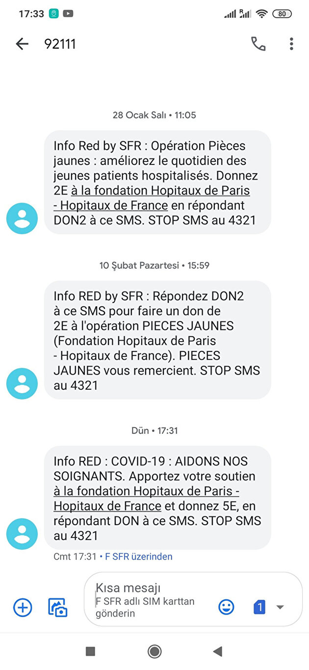 Dünya geneline yayılan koronavirüsün en çok etkilendiği ülke Fransa'da sağlık görevlilerine ek gelir sağlaması için SMS kampanyası başlatıldı. Ülkede sağlık çalışanları sık sık şartların iyileştirilmesi için greve gidiyor.