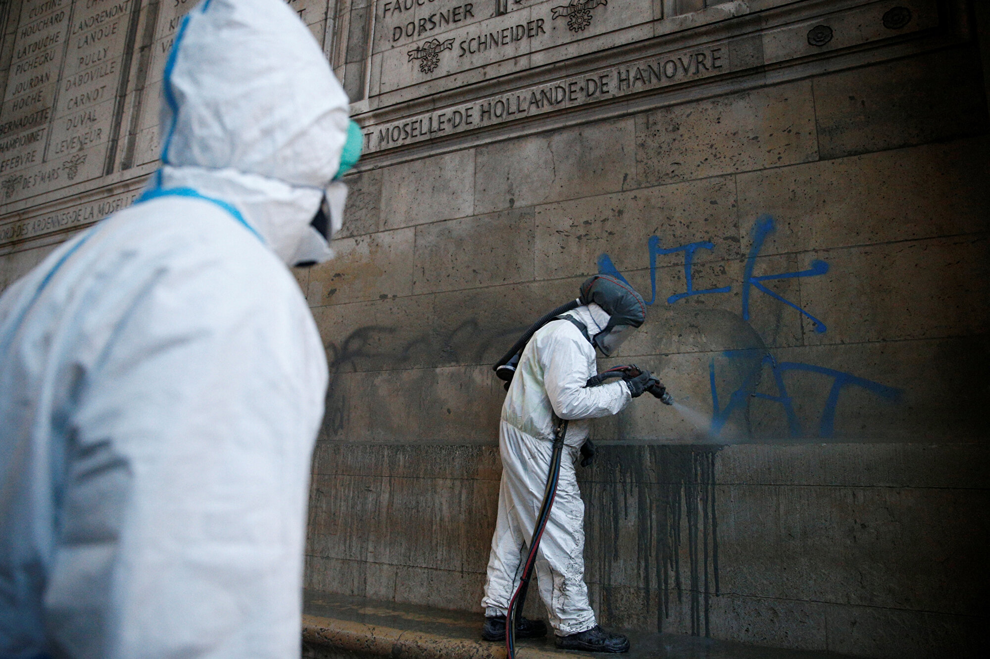 Eylemciler, Fransa'nın bir diğer sembollerinden biri olan Paris’te bulunan Zafer Takı’nda sütunlarını boyarken, anıt üzerine sloganlar yazdı.
