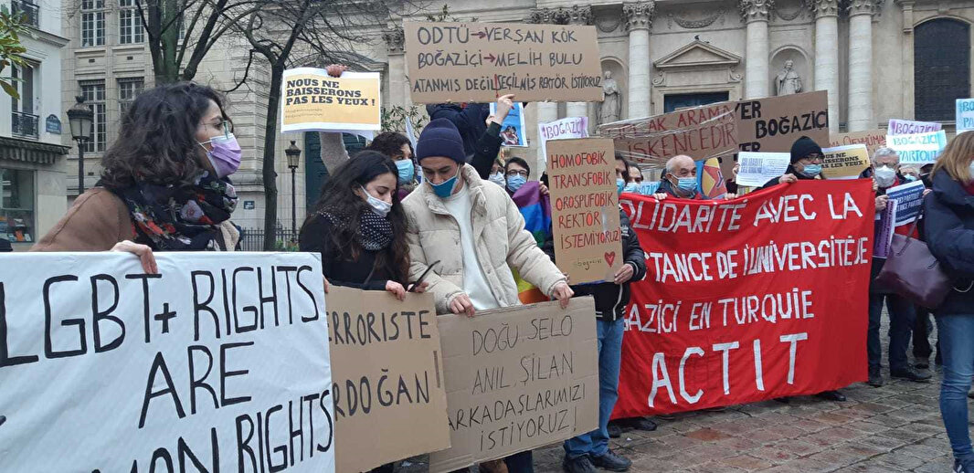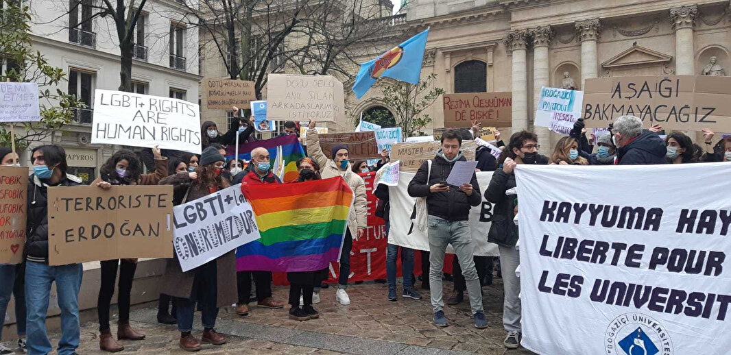 Provokatif olayların sergilendiği Boğaziçi’ndeki eylemler sokak olaylarına dönüştürülmek istenirken, Fransa'da Paris Sorbonne Üniversitesi'nde bir araya gelen PKK destekçileri, ellerinde LGBT bayraklarıyla Boğaziçi olayları için destek eylemi yaptı.