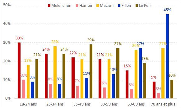 Yaşlı nüfusu oluşturan 60 yaş üstü seçmenlerde ise Macron’a olan destek daha fazla. 60-69 yaş aralığındaki seçmenlerin yüzde 27’si, 70 yaş üstü seçmenlerin ise yüzde 45’i Macron’u destekliyor. Bu yaş aralığındaki seçmenler arasında Le Pen’e olan destek ise gittikçe azalıyor. 60-69 yaş aralığındaki seçmenlerin yüzde 19’u, 70 yaş üstü seçmenlerin de yüzde 10’u Le Pen’de yana oy kullanmış durumda.