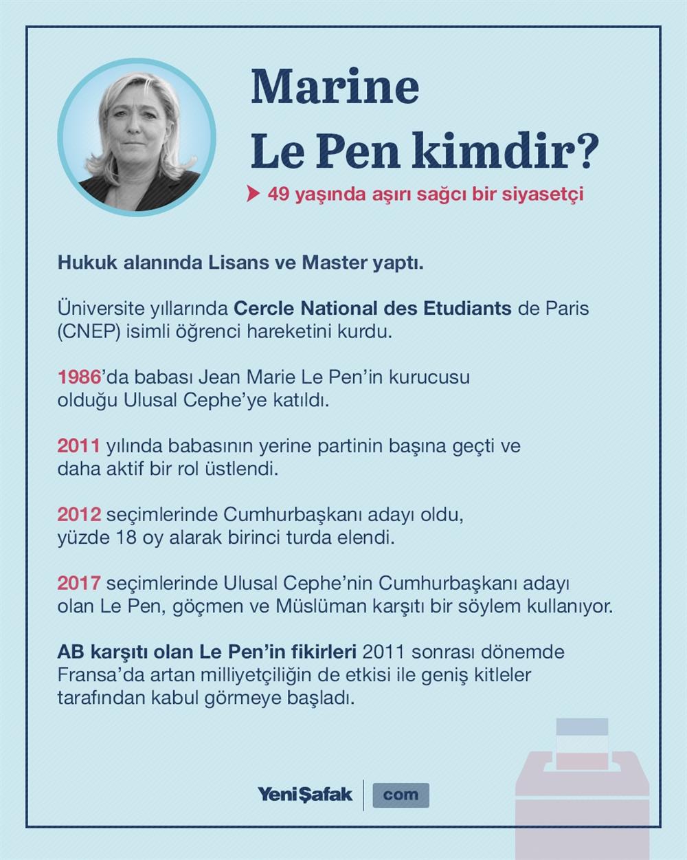 Fransa’da dün gerçekleşen Cumhurbaşkanlığı seçimlerinin ilk tur sonuçlarına göre aşırı sağ parti Ulusal Cephe’nin lideri Le Pen ve liberal söylemler kullanan Emmanuel Macron ikinci tura kalan isimler oldu. Macron yüzde 23,7 ile birinci, aşırı sağcı ve göçmen karşıtı fikirleri ile tanınan Le Pen ise yüzde 21,4’lük oy oranı ile ikinci oldu.