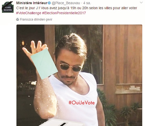 Fransa İçişleri Bakanlığı, resmi Twitter hesabından, restoranında müşterilerine hazırladığı etlere tuz atma şekliyle dünya çapında fenomen haline gelen iş adamı Nusret’in fotoğrafını paylaşarak oy kullanma çağrısı yaptı. Bakanlığın resmi Twitter hesabından yayımlanan mesajda, “Yaşadığınız şehre bağlı olarak saat 19.00 veya 20.00’ye kadar oy kullanabilirsiniz.” ifadelerine yer verildi. Fransa İçişleri Bakanlığının Nusret’li çağrısı Twitter’da kısa sürede en çok paylaşılan tweet oldu.
